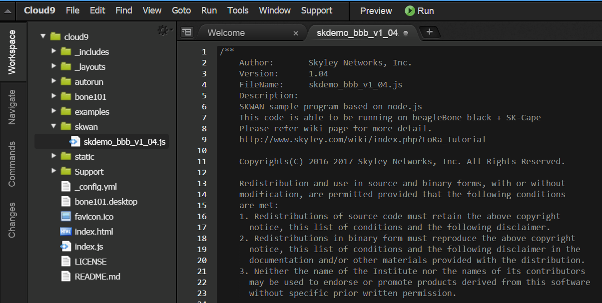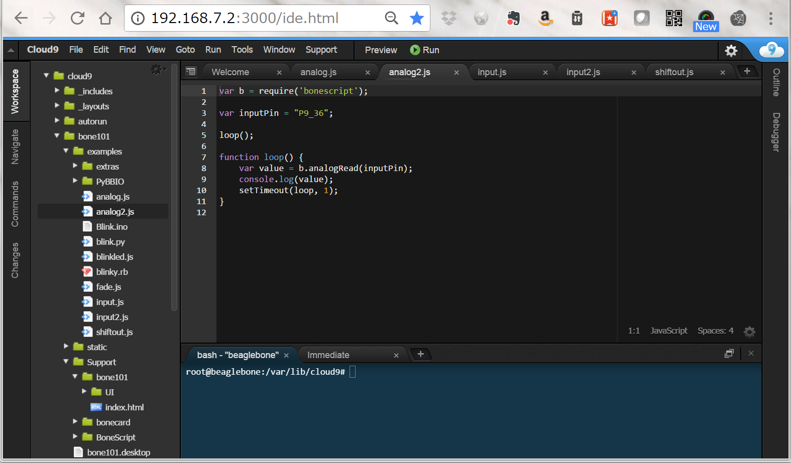 BBBのCloud9にはBonescriptと呼ばれるnode.js上で動作するJavascriptのライブラリ環境がインストールされています。Bonescriptを使う事で簡単にBBBのI/O制御を含むプログラムの開発が可能です。