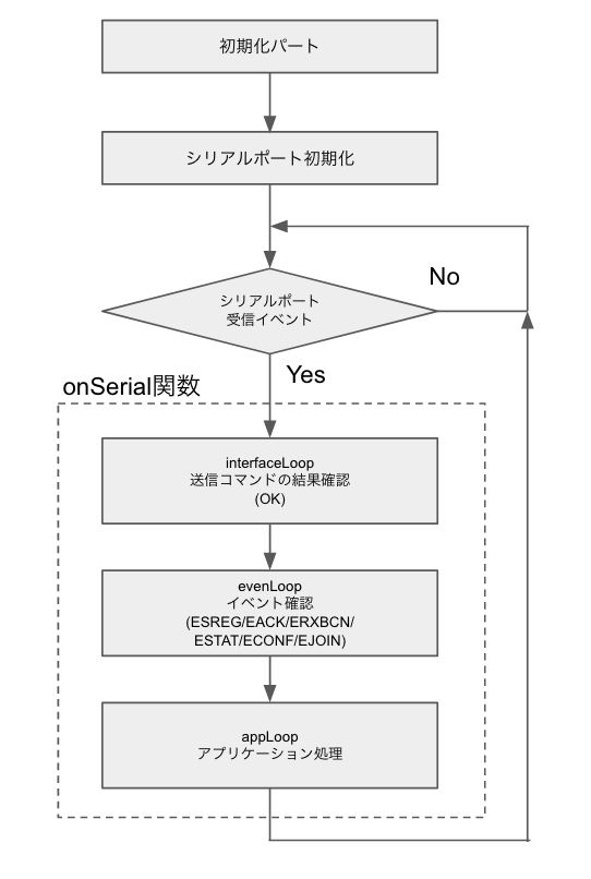 | ECONF 00 00:00:00:00:00:00:00:00 0025 | ビーコンを受信すると子機は接続要求を親機へ送信します。ECONFはその送信要求の結果を示します。最初の0x00は上り送信要求が成功した事を意味します。 |